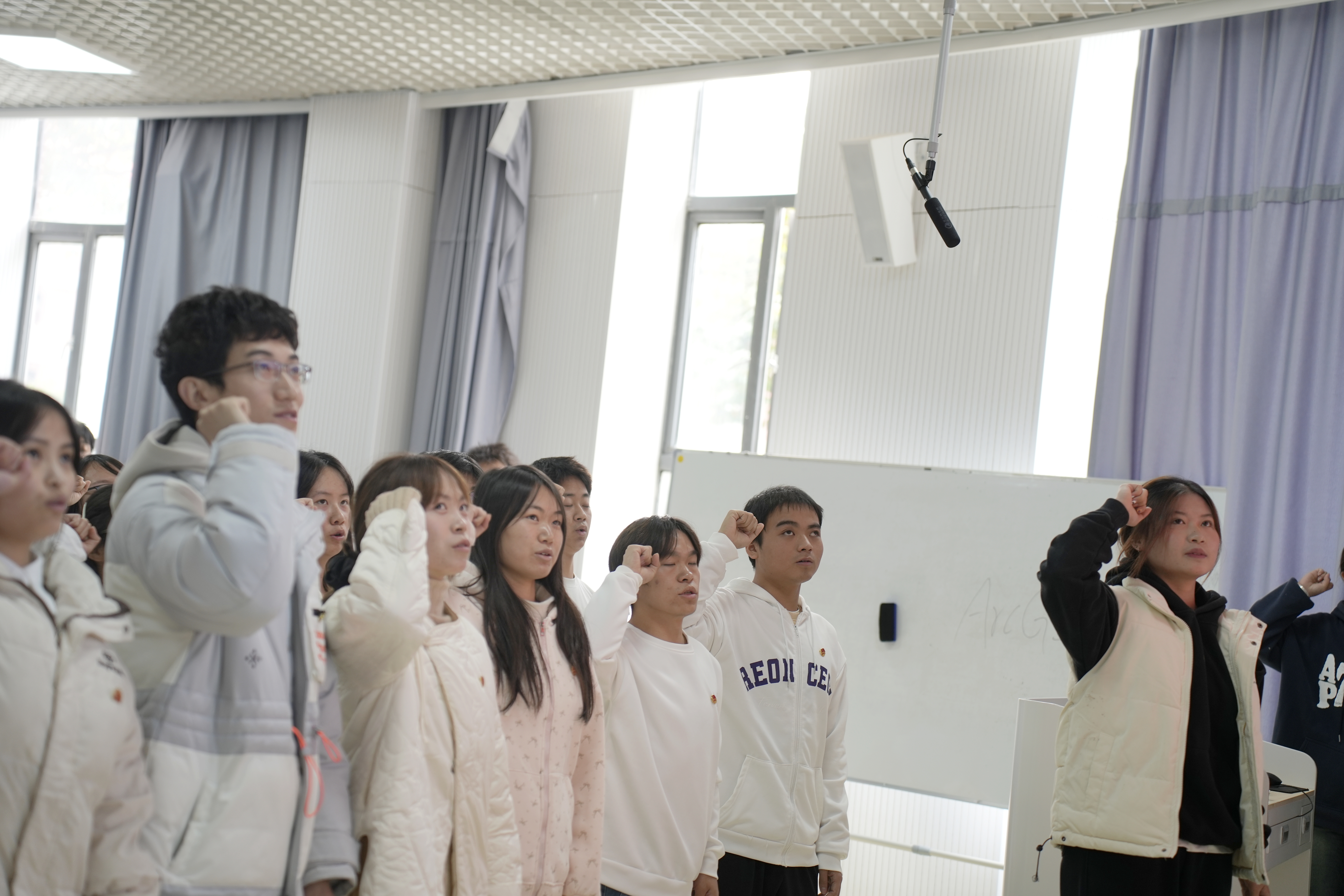 仪式在庄严的中华人民共和国国歌声中拉开帷幕。首先宣读了新团员名单,本次共有21名同学经过严格考察,光荣加入中国共产主义青年团。随后,李书和贺婧为新团员佩戴团徽,熠熠生辉的团徽象征着责任与使命,标志着新团员正式成为共青团大家庭的一员。